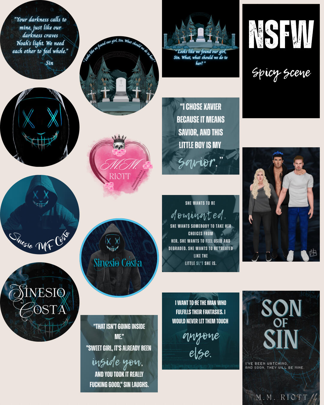 Son of SinSin: I’ve been watching them. Their perfect relationship is cozy, but I take what I want. And I want them… I want a family with them.Kieran: I’ve never wanted kids, but what am I supposed to do when that’s forced on me? Not take that shit lying down… that’s for sure.Noah: I only need her… or that’s what I thought. But maybe I just needed someone to break through my barriers and all the hatred my father instilled in me.